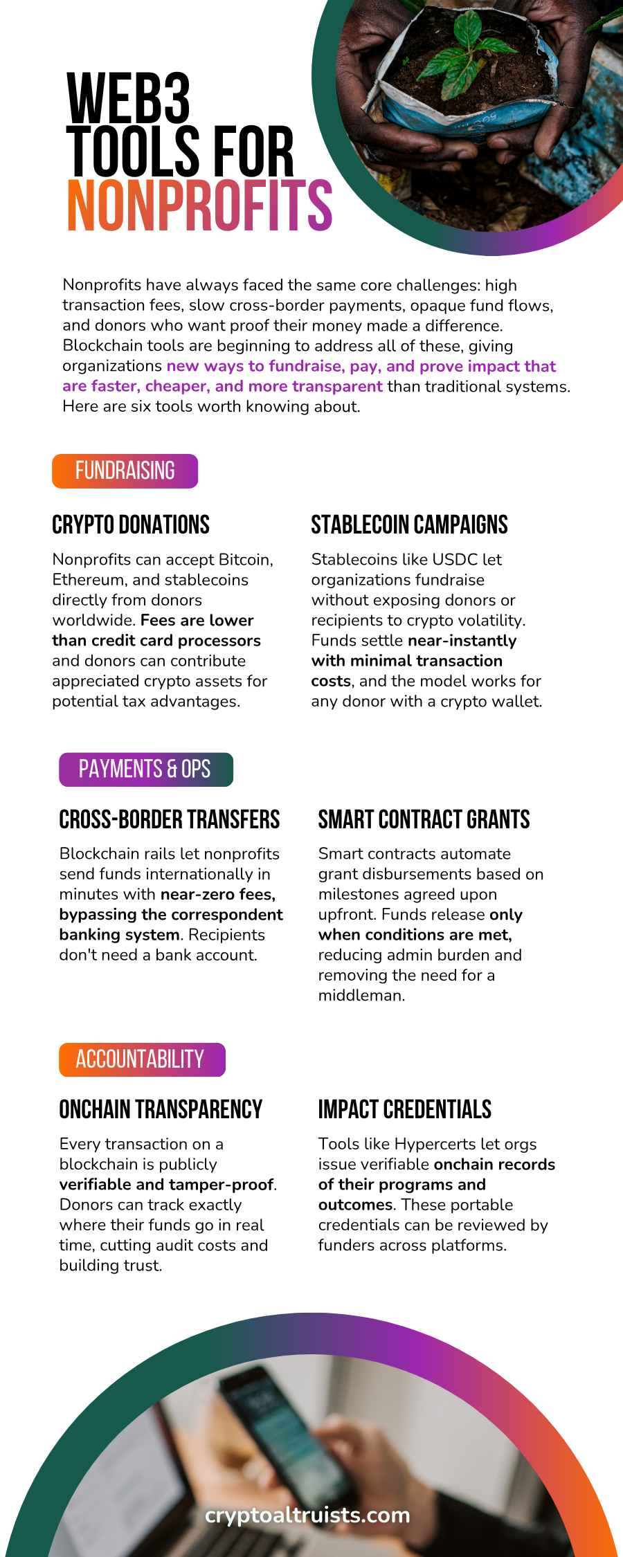 These six tools are just the beginning. As blockchain infrastructure matures and adoption grows, nonprofits will have access to an expanding toolkit for fundraising, operations, and accountability; one that's faster, cheaper, and more transparent than anything that came before.