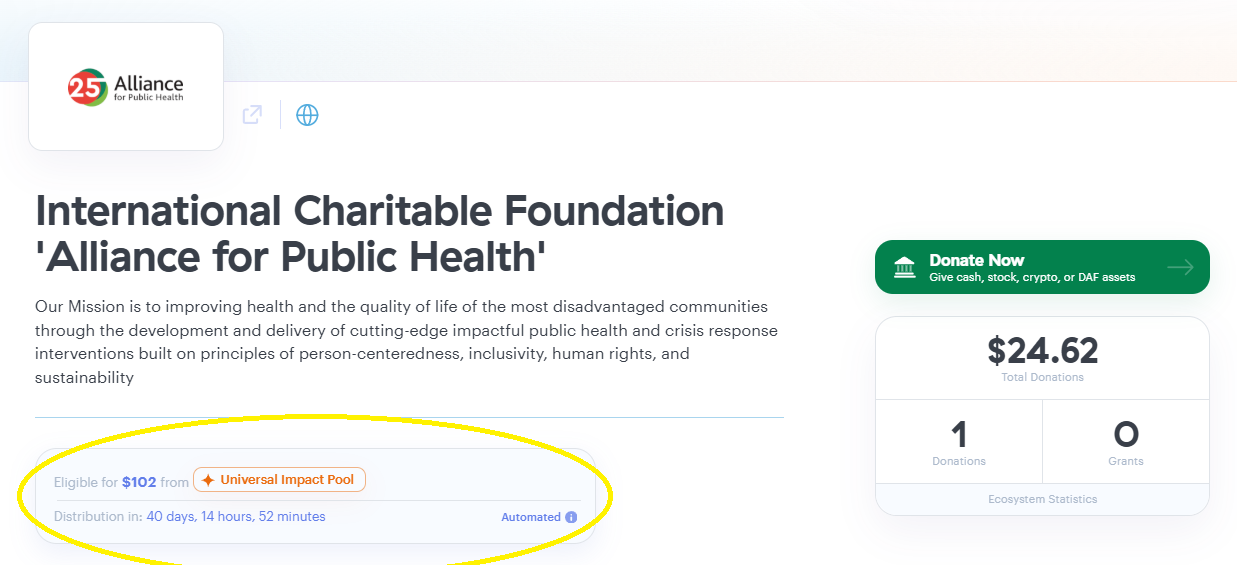 In the quest to achieve long-term sustainability, Web3 opens the door to fundraising mechanisms that simply didn't exist before. One example: by donating just 25 USDC through Endaoment, APH was automatically eligible for $100 in matching funds through Endaoment's Universal Impact Pool.
